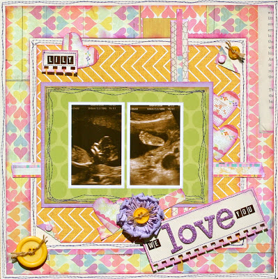 I only made a few minor changes to my own layout, following Mel's to be closely the same yet a little different. I thought theses papers perfect for page one of my upcoming baby album. I have kept it no secret I am having a girl and now by showing this I am announcing her name too, I am ok with this ;-)
